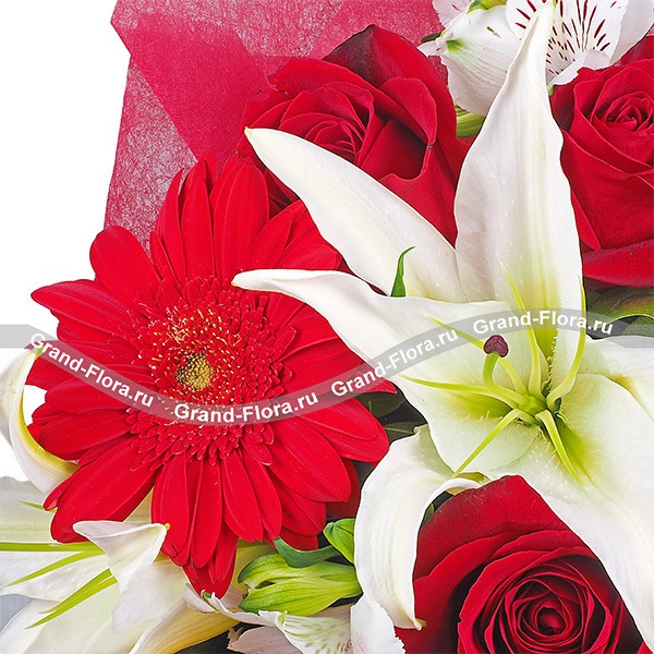 Восхищались ли вы когда-нибудь грациозностью, нежностью и трогательностью лебедей? Именно такие смешанные чувства вызывает этот чудесный букет. Дизайнеры-флористы добавили к красной гербере розу в тон и разбавили белыми лилиями — получилась сказочная красота.