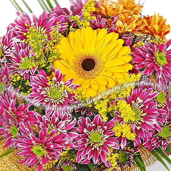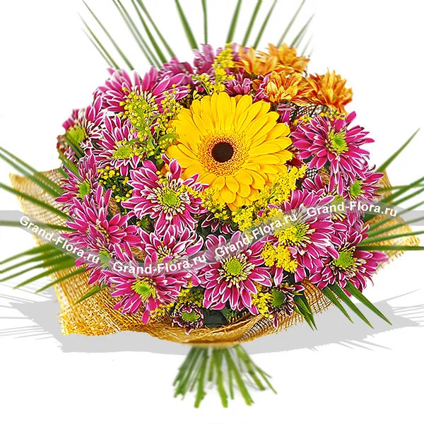 Этот восторженный букет с ярко-желтым гербером в центре заставляет улыбаться навстречу солнцу и ценить прекрасные моменты. Именно один из таких моментов вы можете подарить своим близким, презентовав такой букет. Экзотические нотки добавляют листья зелени, пестрые хризантемы символизируют счастье и долголетие. Наверняка этот букет оценит ваша мама или бабушка, сделайте им очаровательный подарок, заказав букет с доставкой у нас.