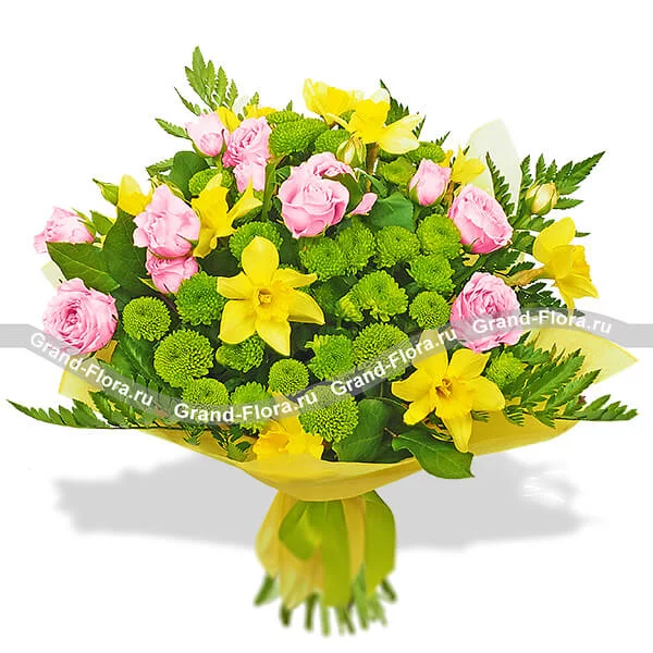ЛЮКС: роза кустовая розовая - 4 шт, хризантема кустовая зеленая (сантини) - 3 шт, нарциссы - 5 шт, декоративная зелень, фетр желтый.